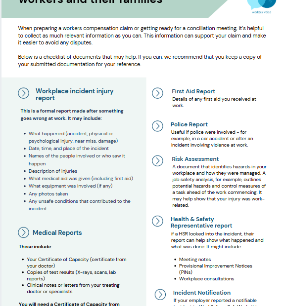When preparing a workers compensation claim or getting ready for a conciliation meeting, it’s helpful to collect as much relevant information as you can. This information can support your claim and make it easier to avoid any disputes. This resource acts as a checklist of documents that may help. If you can, we recommend that you keep a copy of your submitted documentation for your reference. Download here.