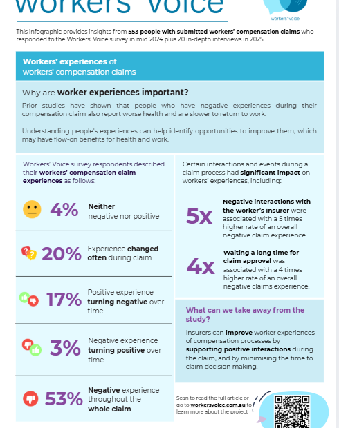 This infographic explains what the workers’ experiences of workers’ compensation claims are and why they are important. It also outlines sources of stress during a workers’ compensation claim. Download the document here.