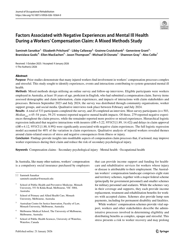 A recent publication, Factors Associated with Negative Experiences and Mental Ill Health During a Workers’ Compensation Claim: A Mixed Methods Study was recently published in the Journal of Occupational Rehabilitation. The latest findings from the Workers’ Voice study explored what aspects of workers’ compensation claims contribute to negative experiences and mental ill health among injured workers in Australia.